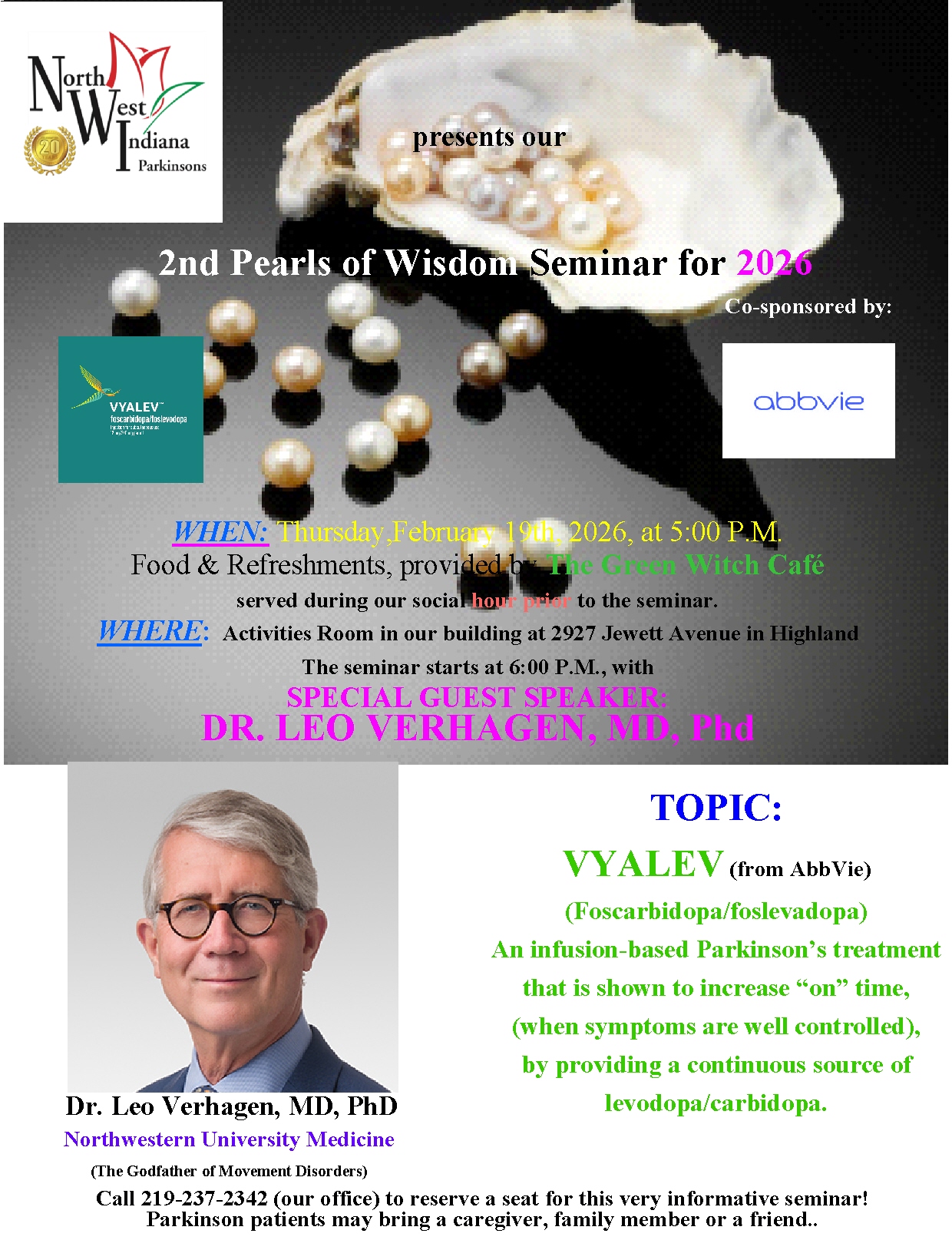 Research has proven that exercise, such as Dance, Yoga and Boxing, can help individuals with PD achieve improved mobility and slows the progression of the disease. NWI Parkinson’s provides a multitude of FREE services to these individuals and their caregivers. FREE classes are offered weekly and include Dance for PD, Boxing, Yoga, Full-Body Workouts, Cardio Drumming Class, Chair Zumba and a NEW Speak Out Class! Other FREE services include weekly Discussion Groups, led by a nurse, Support Groups and monthly Pearls of Wisdom educational seminars, given by experts in their field on various topics, including Medication Management, Nutrition, and the latest PD Research, to name a few.