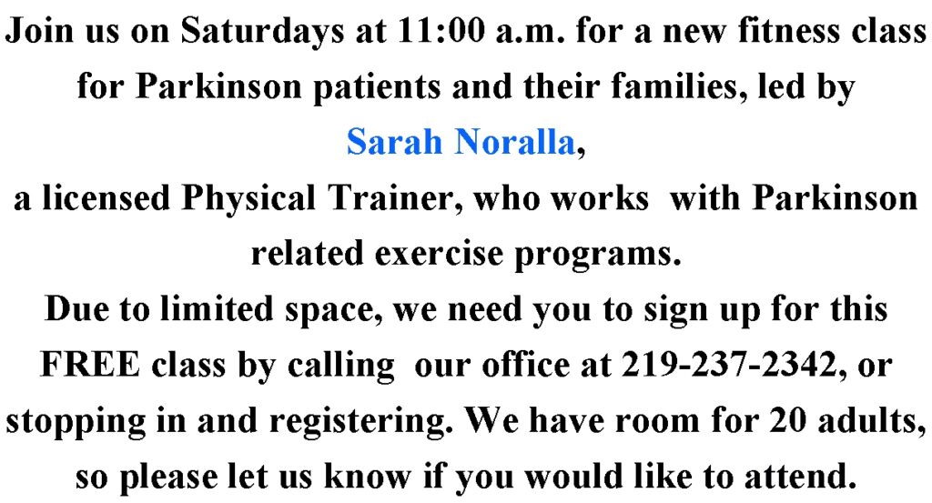 NWI Parkinson’s Mission Statement is, “To give Parkinson patients HOPE, to know that they are not alone, and that we are bringing them together for exercise, companionship and to find ways to improve their quality of life.”